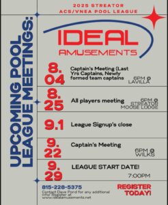Pool League Schedules STREATOR TEAM 8 BALL SCHEDULE STREATOR SINGLES 8 BALL SCHEDULE Rules ACS RULEBOOK VNEA RULEBOOK Stats STREATOR TEAM 8 BALL STATS (TEAM STATS) STREATOR TEAM 8 BALL STATS (PLAYER STATS) STREATOR SINGLES 8 BALL STATS CLICK HERE TO SIGN UP FOR 2025 POOL LEAGUE